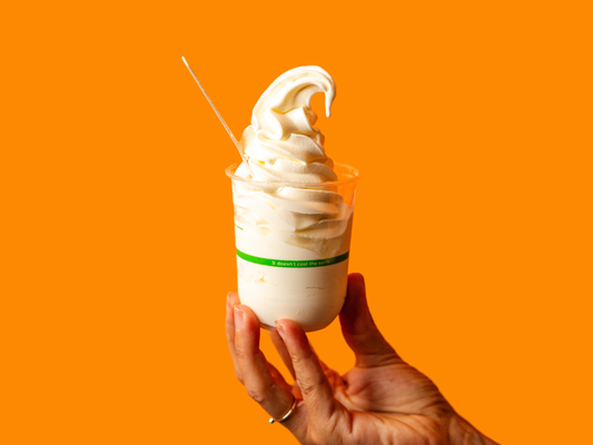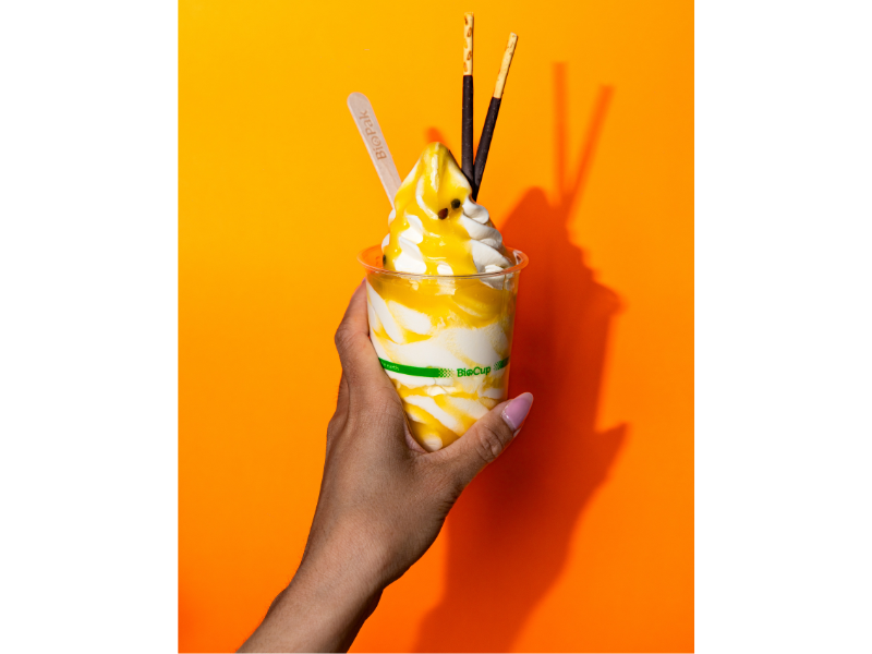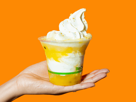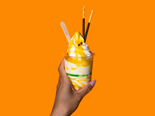 Creamy TT® Soft Serve Ice-cream, drizzled with yuzu passionfruit sauce. Topped with TWO chocolate-coated Pocky® sticks.