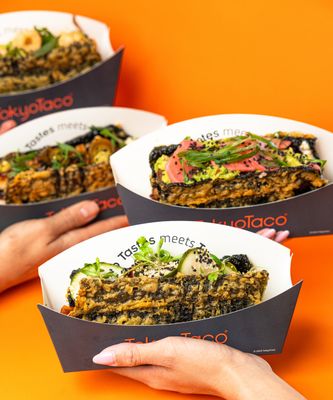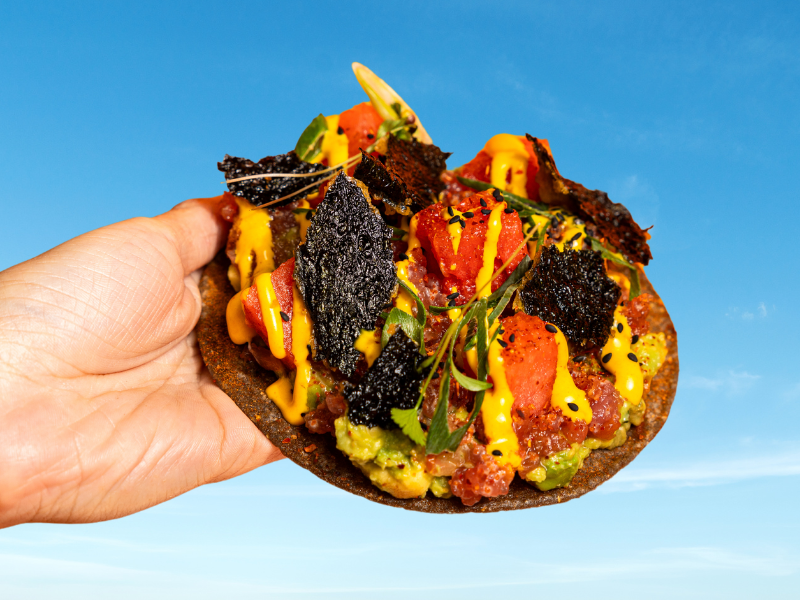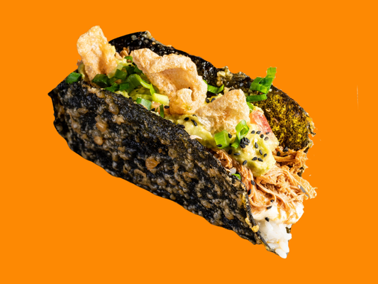 White sushi rice, BBQ pulled pork, TT® lime guacamole, Japanese mayonnaise , fresh herbs and pork crackle chicharron