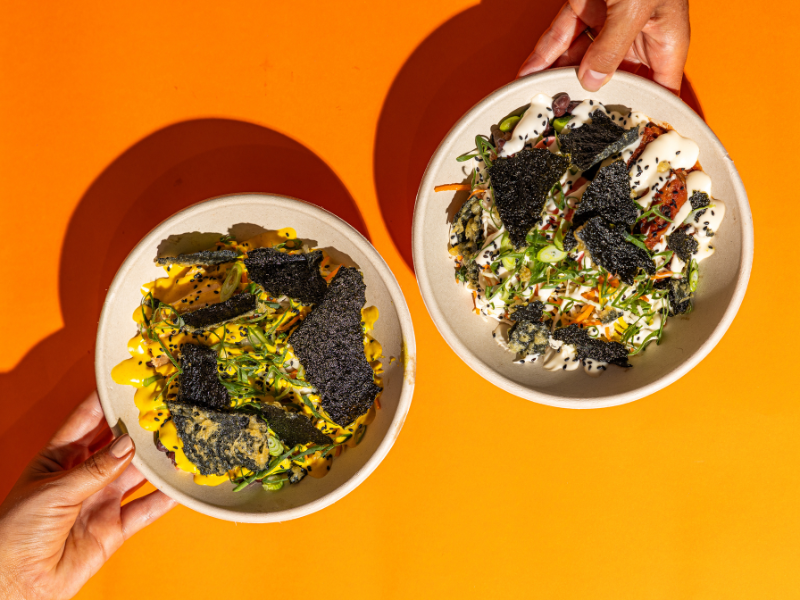 Wholegrain brown rice, adobo braised jackfruit, edamame black bean salsa, pico de gallo, cabbage slaw, pickled radish, umami mayo and crispy nori