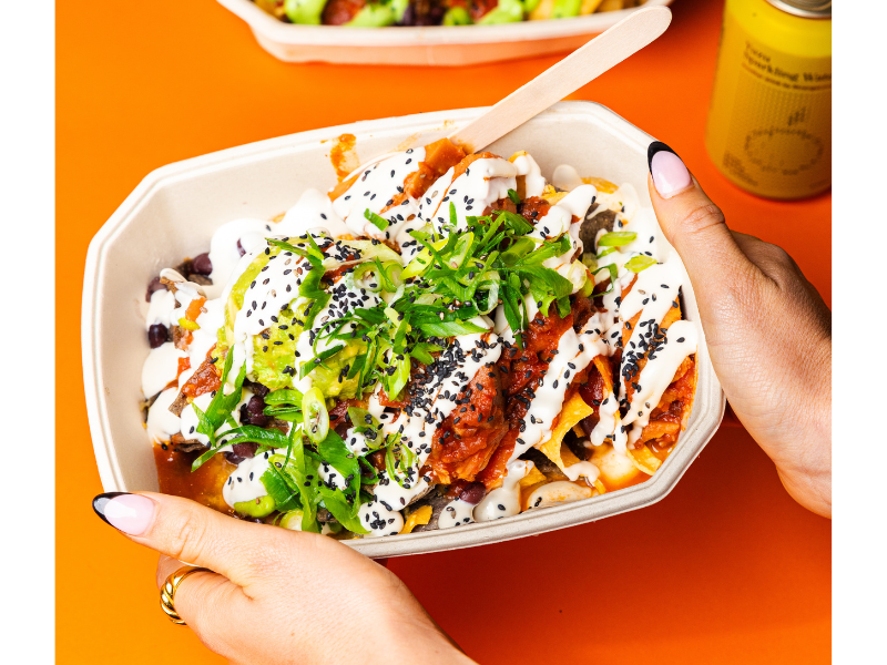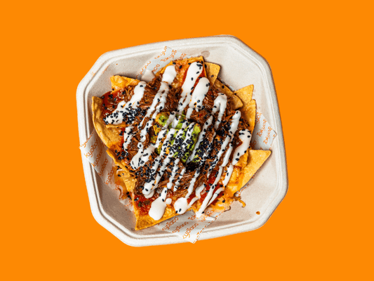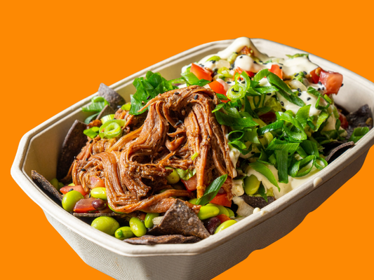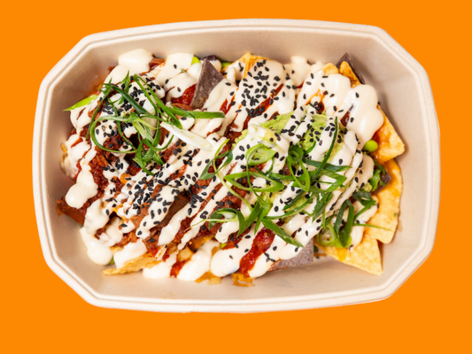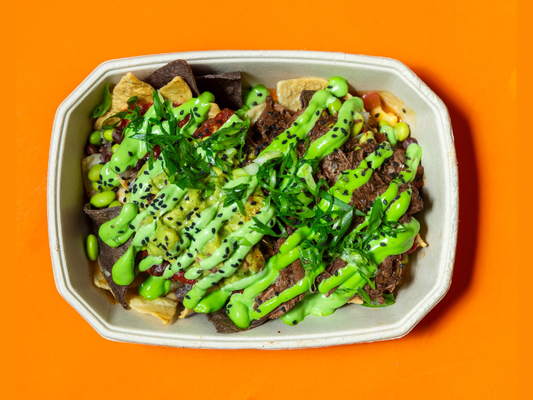 Blue corn tortilla chips, TT® lime guacamole, edamame black bean salsa, pico de gallo salsa, melted jack cheese, pulled beef, sweet & spicy jalapeño mayo and sesame