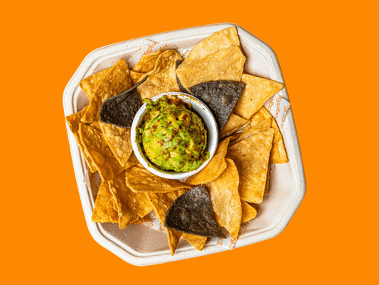 Blue & yellow corn tortilla chips, TT® lime guacamole & crispy nori