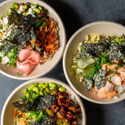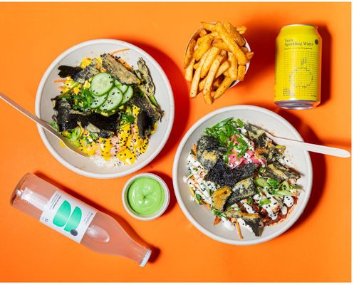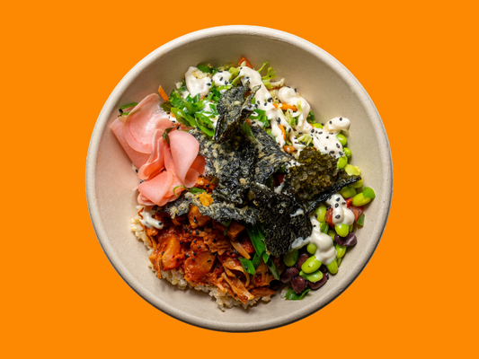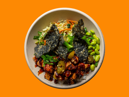 White sushi rice, grilled free-range chicken, edamame black bean salsa, pico de gallo, cabbage slaw, sliced jalapenos, mild caramelised chilli sauce and crispy nori