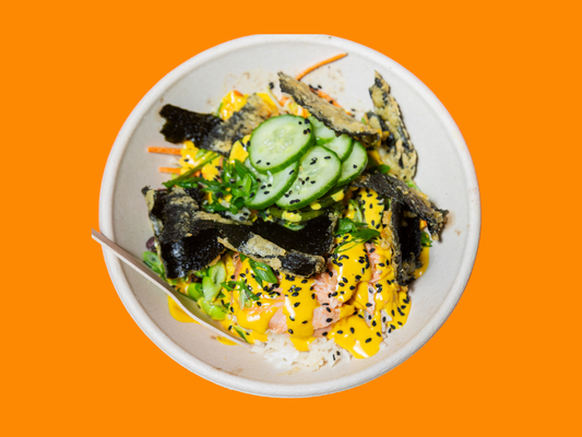 White sushi rice, miso baked salmon, Japanese mayonnaise, pickled cucumber, mild caramelised chilli sauce, coriander and sesame