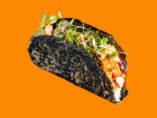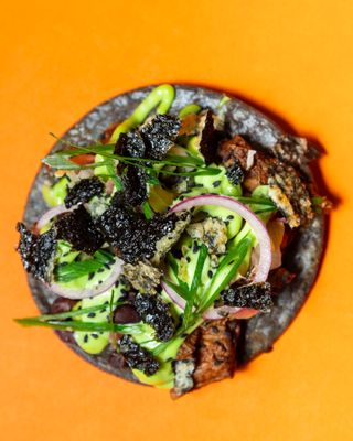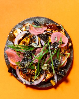 Chipotle braised tofu, BBQ corn salsa, red onion, pickled radish, crispy nori and fresh herbs